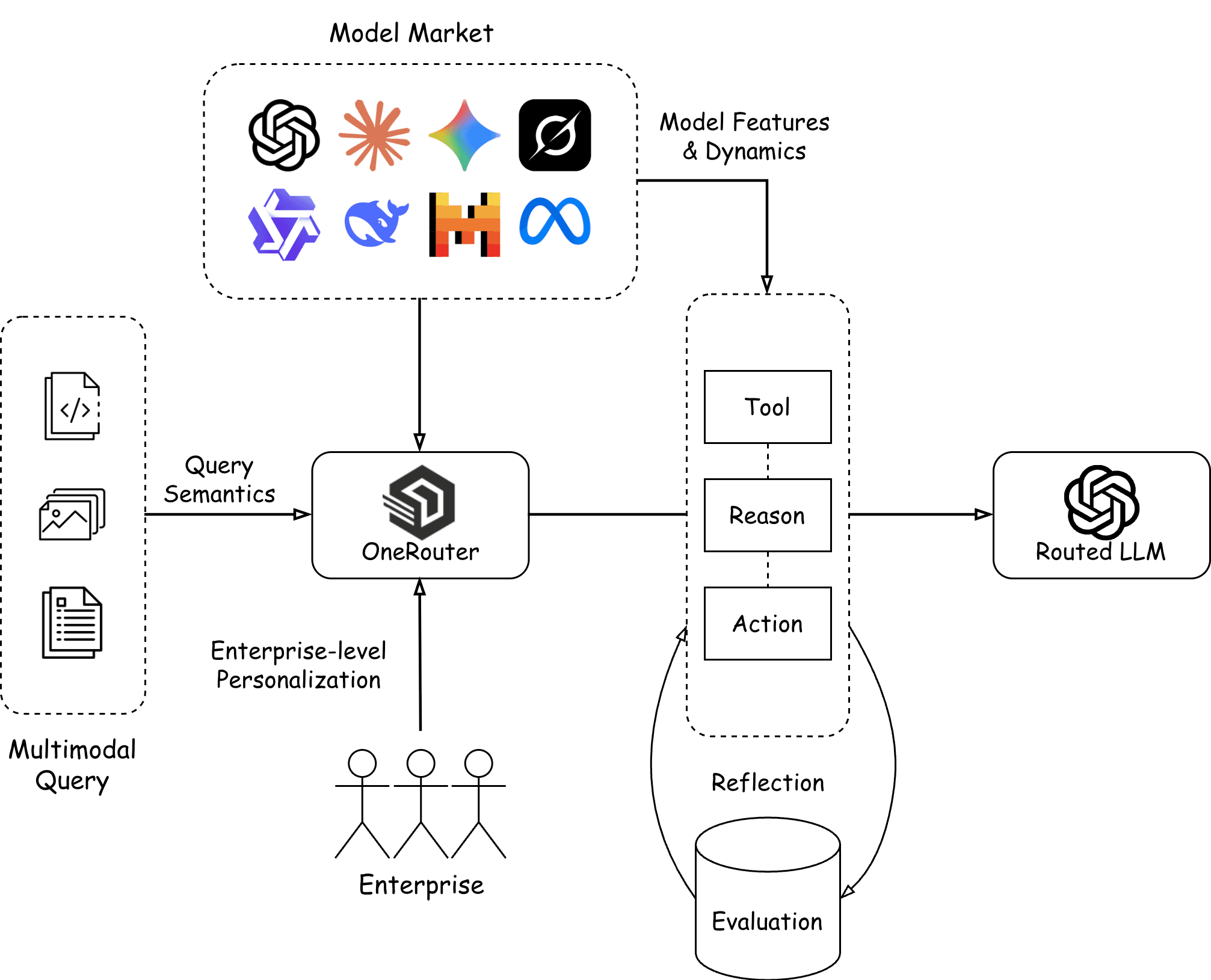 This reasoning-driven approach enables the router to synthesize complex, multi-dimensional trade-offs that static classifiers cannot handle: balancing cost against latency for time-sensitive workflows, incorporating enterprise-specific historical patterns, and adapting to real-time market dynamics. By treating routing as a reasoning task rather than a classification problem, OneRouter transforms routing decisions from one-time lookups into a continuous learning process that builds collective intelligence from enterprise usage patterns.