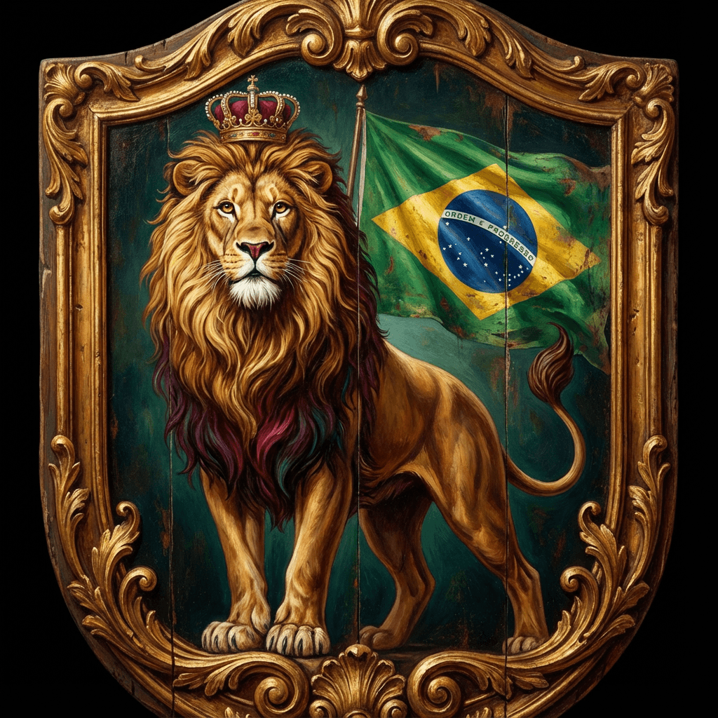 a close up of a lion with a flag in the background, baroque, 2 d full body lion, , gwent, Brazil, Brazil flag